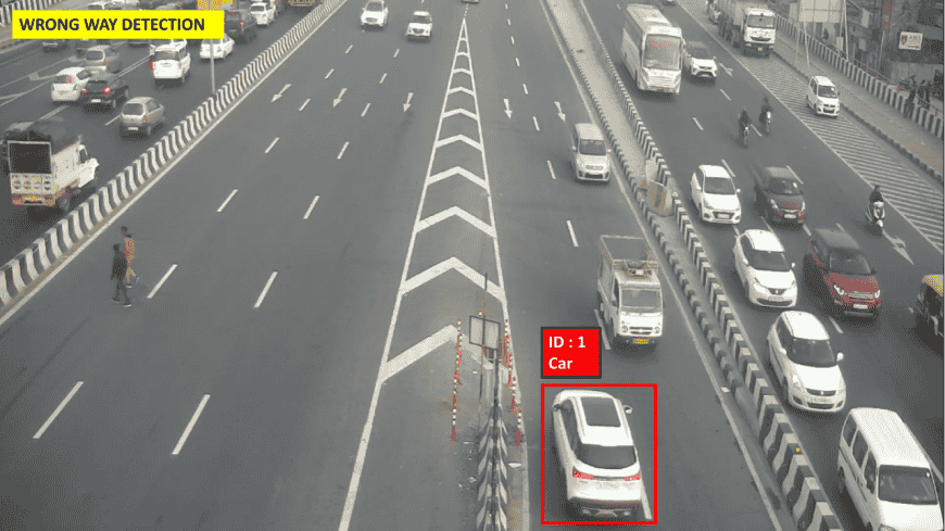 Vehicle wrong-way detection analytics provides an Intelligent Solution for traffic management by detecting vehicles going in the wrong way on the road. It sends an alarm and video feed to the central server when any vehicle moves in the wrong direction.